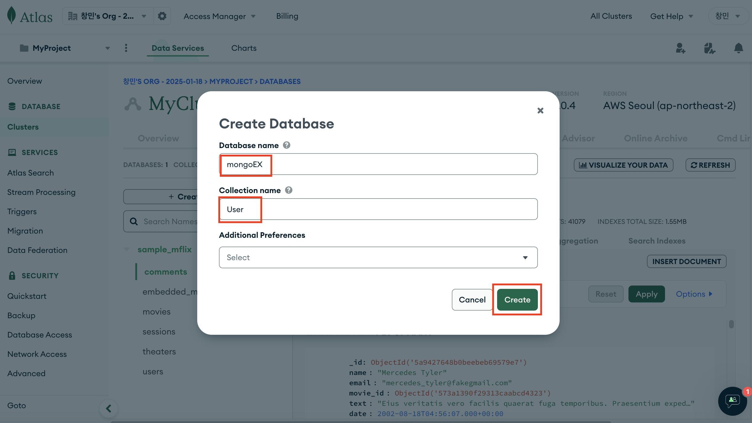 3. 데이터베이스, 컬렉션 정보 기입 후 Create 클릭
