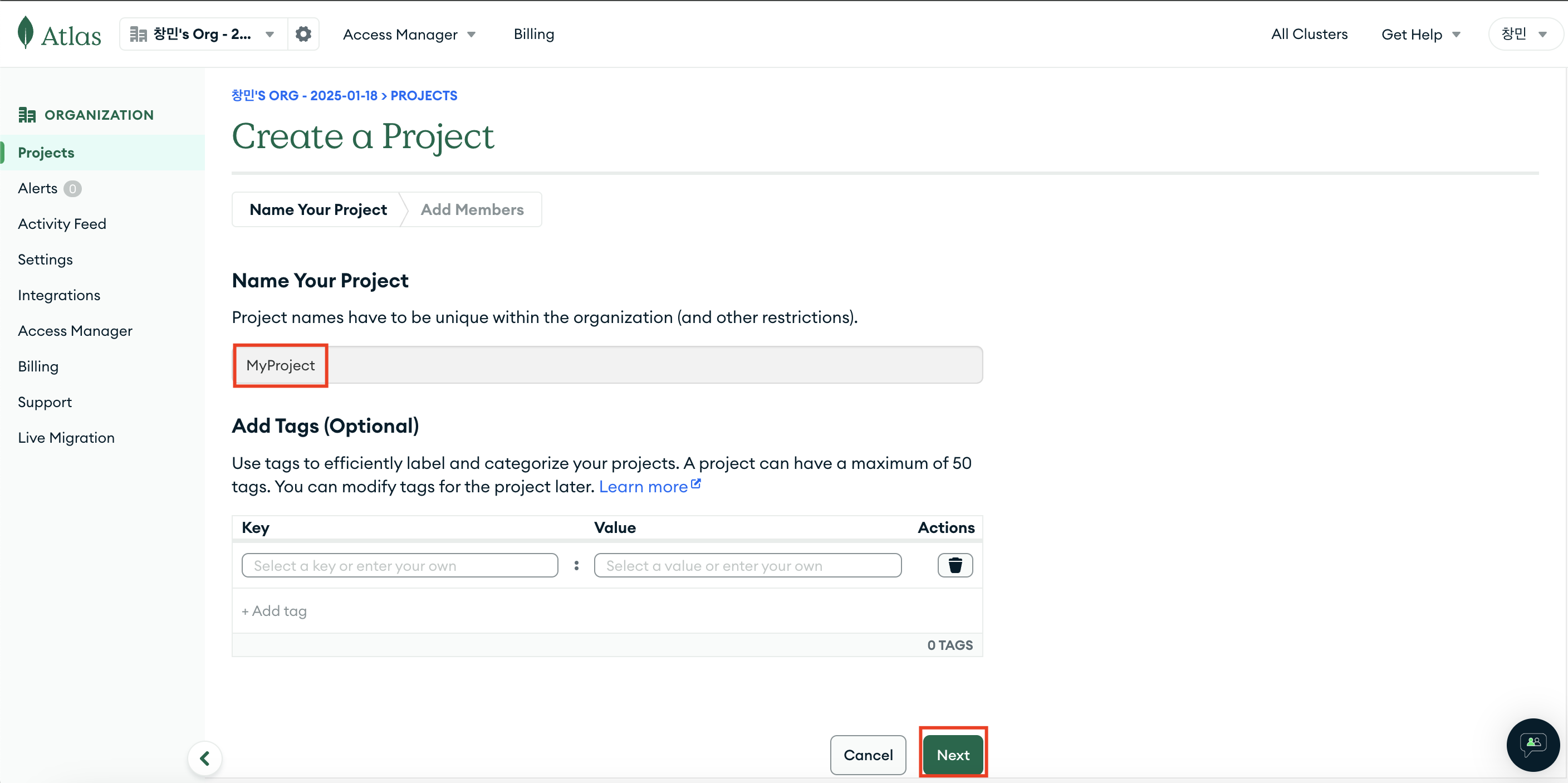 3. 이름 입력 (태그는 선택적으로 입력) → Next 클릭