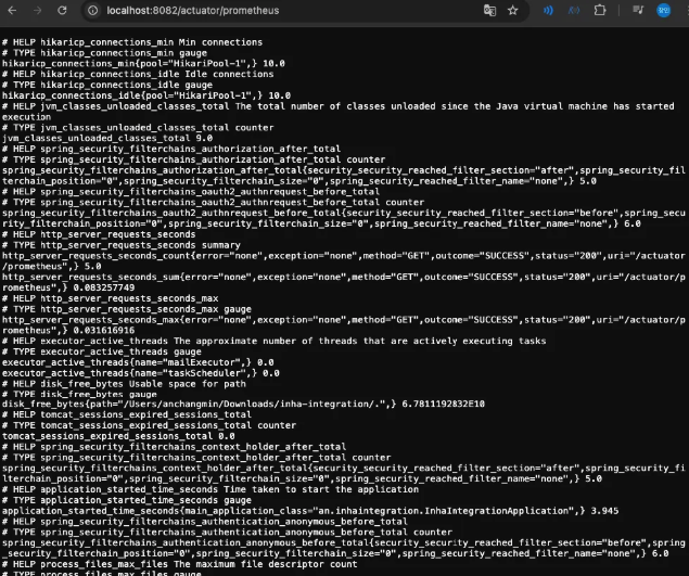⇒ 해당 엔드포인트를 제공하게 설정되었는지 확인하려면 /actuator/prometheus 로 접속