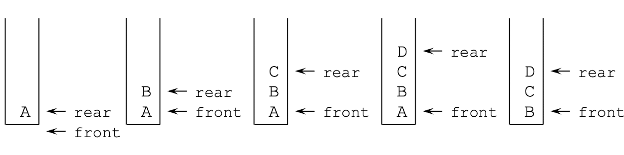 큐에 데이터가 삽입, 삭제되는 일련의 과정들이다. 순서대로 add(A) -> add(B) -> add(C) -> add(D) -> delete() 의 연산이 진행되었다. FIFO의 방식으로 데이터를 관리하는 큐에서는 차례대로 데이터가 삽입되고 앞에서부터 데이터가 삭제됨을 알 수 있는 그림이다.