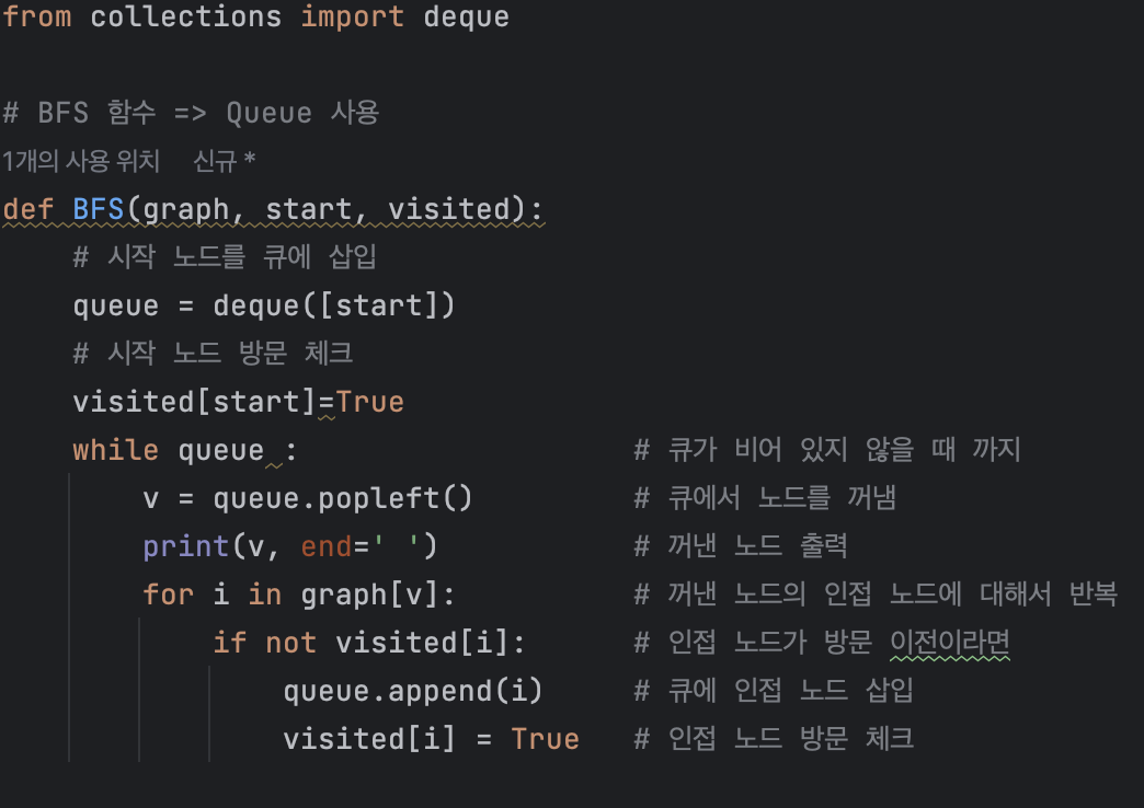 큐를 사용해서 BFS 알고리즘을 구현해야 한다. 이 때 앞선 게시물(https://blogan99.tistory.com/20)을 참고하면 collections 모듈의 deque 라이브러리를 사용하여 큐를 구현하는 것이 이상적임을 알 수 있다.