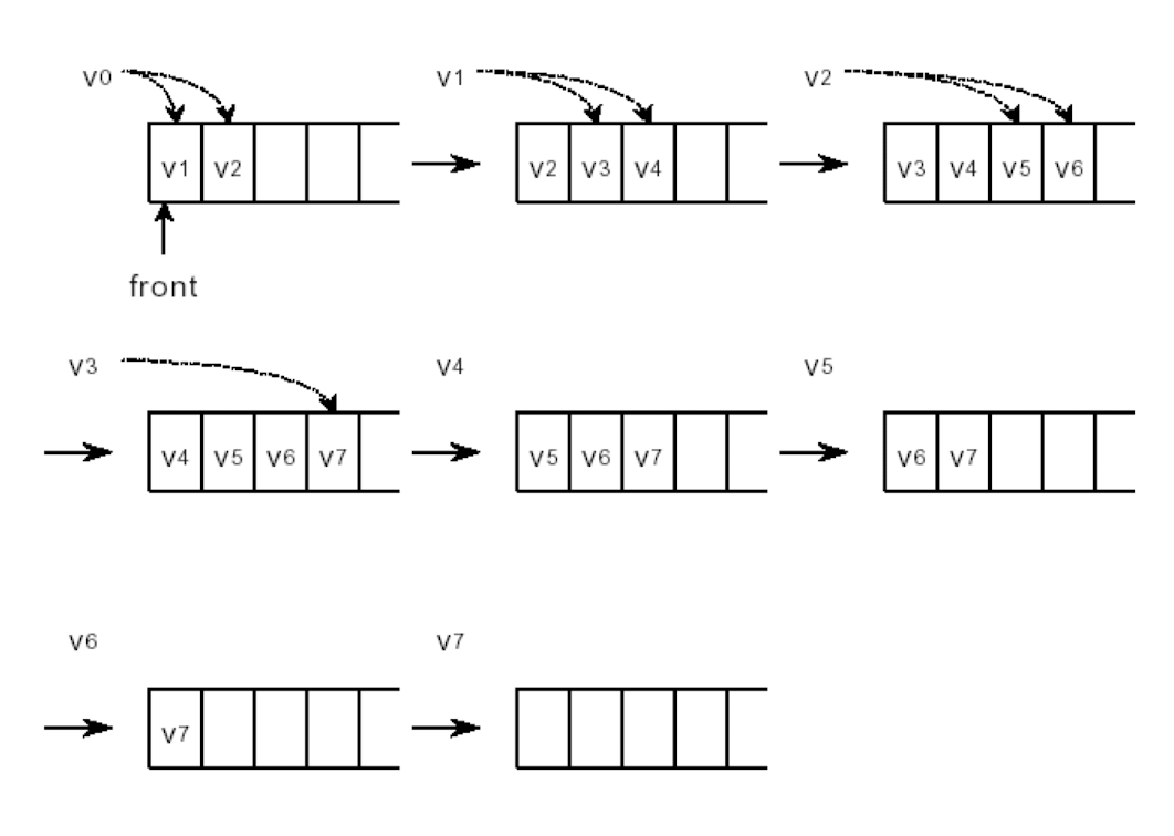 이 그래프를 BFS 알고리즘으로 탐색(순회) 한다고 가정해보자. 먼저 탐색 시작 노드를 V0로 설정했을 때, 탐색 순서는 다음과 같다.