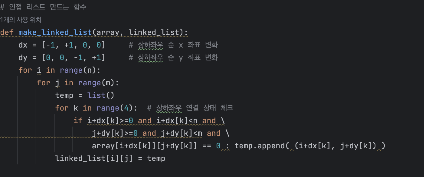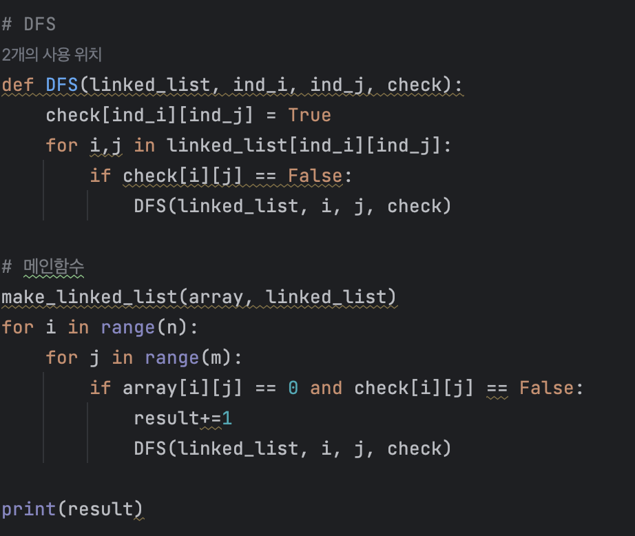또한 방문 여부를 체크할 수 있는 N x M 의 2차원 리스트를 생성한다. 그리고 2중 반복문을 돌면서 입력에서 0을 만나게 되면 방문했는지를 체크하고 만약 방문하지 않았다면 DFS 함수를 호출한다. DFS 함수에서는 앞의 예제에서 힌트를 얻어서 해당 인덱스를 방문했다고 체크하고, 생성해둔 인접 리스트의 해당 인덱스에 접근해서 인접한 노드(인덱스) 에 대해 DFS 함수를 재귀적으로 호출하는 것이다.