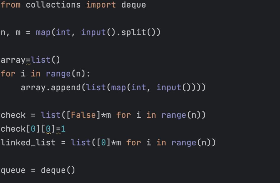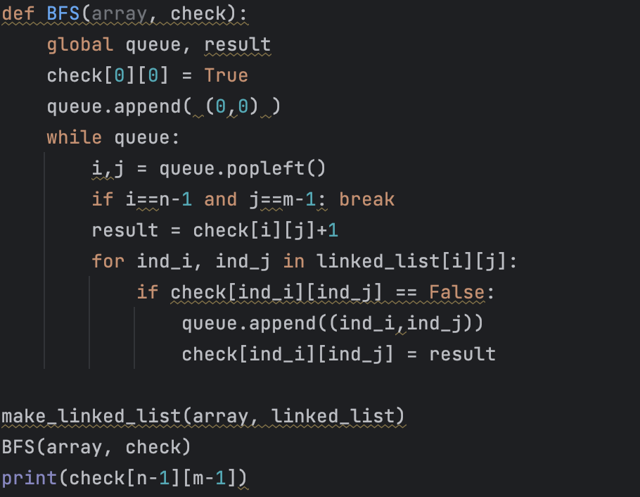 다음으로 BFS 함수를 구현하기 위해서 큐를 사용해야 하므로 from collections import deque 구문을 통해서 collections 모듈의 deque 라이브러리를 추출한다. BFS 함수에서는 빈 큐를 한 개 만들고, 첫 시작좌표를 삽입한다. 이 때 첫 시작좌표에 대한 방문 여부 또한 체크한다. 이후 while 반복문을 돌면서 큐에서 값을 하나씩 뺀다. (이 때 뺀 값이 마지막 칸의 좌표와 같으면 반복문을 break를 통해서 빠져 나온다.) 그런 과정에서 칸 수를 추출하고 1을 더한 값을 체크 리스트의 해당 인덱스에 저장한다.