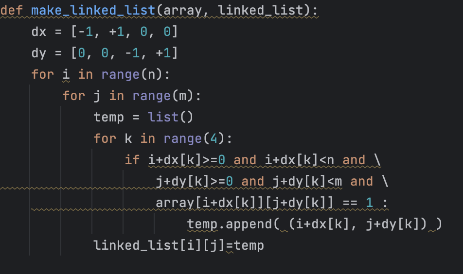 앞의 문제와 같이 입력이 2차원 리스트이므로 각각의 노드는 행값, 열값 즉 2개의 값(인덱스)을 갖게 된다. 따라서 인접 행렬 보다는 인접 리스트를 구현하는 편이 낫다고 생각했고, 앞의 문제와 동일하게 N x M 의 반복문을 돌면서 1인 칸에 대해서 상하좌우에 인접한 1이 있는 인덱스들을 모두 해당 칸의 값으로 저장해서 인접 리스트를 구현했다.