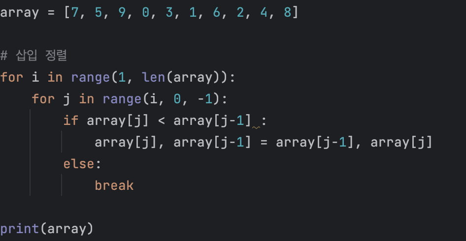 소스코드는 위와 같다. 먼저 데이터의 개수 만큼 반복문을 돌린다. 첫 번째 반복문 내에서 두 번째 반복문을 돌리는데 이 때 해당 데이터의 인덱스부터 첫 번째 요소까지 접근한다. 두 번째 반복문 내에서는 앞선 요소보다 해당 요소가 작다면 계속 데이터의 위치를 바꿔주는 연산을 실시함으로써 삽입 정렬을 구현할 수 있는 것이다.