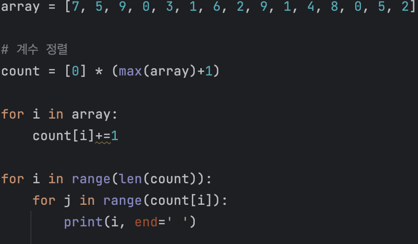 결과적으로 위의 리스트에는 해당 숫자가 몇번 등장하는 지 횟수가 저장되는 것이다. 마지막으로 출력과정에서 카운트 한 갯수만큼 인덱스를 출력해주면 정렬이 완료되는 것이다.