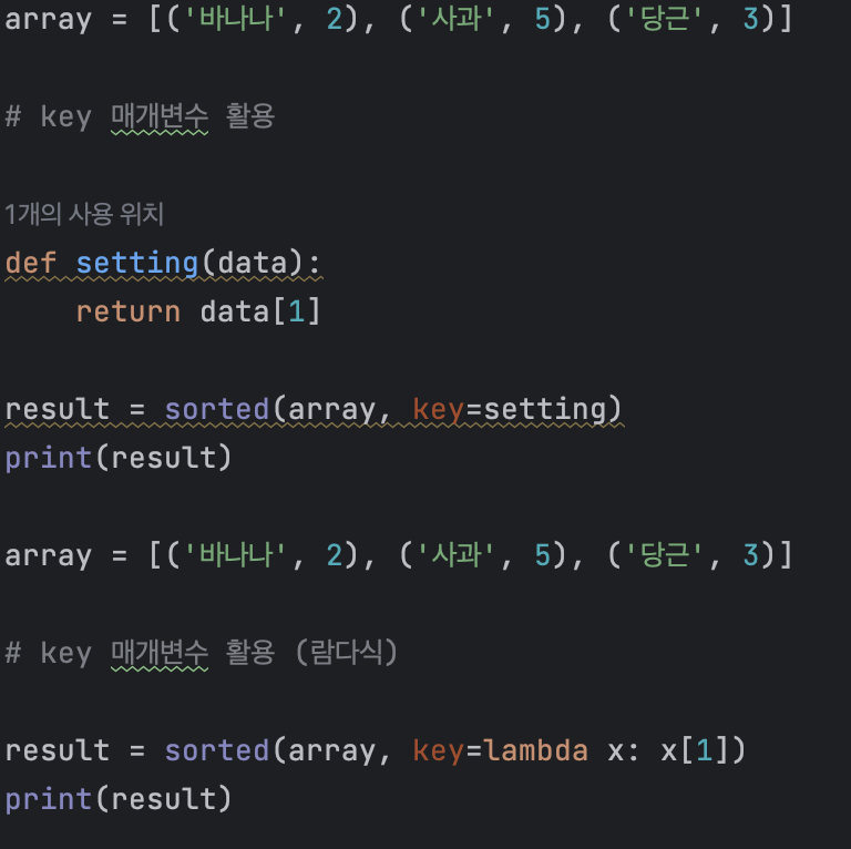 이 함수들을 사용할 때 key 매개변수를 입력으로 받을 수 있다. key 값으로는 하나의 함수가 들어가야 하며, 이는 정렬의 기준이 된다. 만약 데이터가 튜플의 형태로 리스트에 저장되어 있을 때를 가정해보자. 각 데이터 (튜플)의 두 번째 값을 기준으로 정렬을 수행하는 소스코드는 아래와 같다. 또한 key 값으로 함수가 들어가야 한다고 했으므로 이를 람다식으로 표현할 수도 있다.