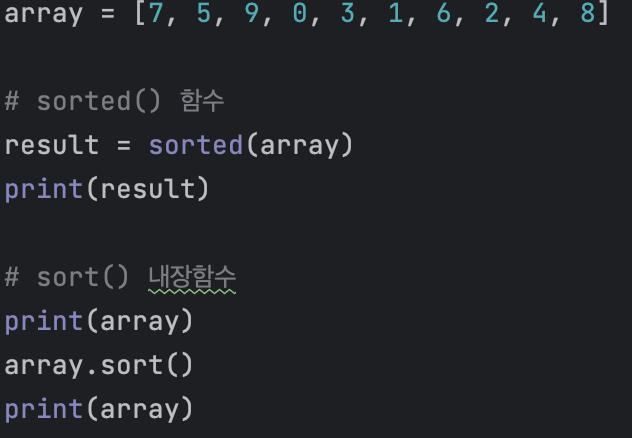 - 이와는 조금 다르게 리스트에서 내부적으로 정렬을 수행하는 방법도 존재한다. 바로 리스트 객체의 내장 함수인 sort()를 이용하는 것이다. 이 내장 함수를 사용하면 새로운 리스트가 반환되지 않고 기존 리스트의 요소가 내부적으로 정렬된다.
