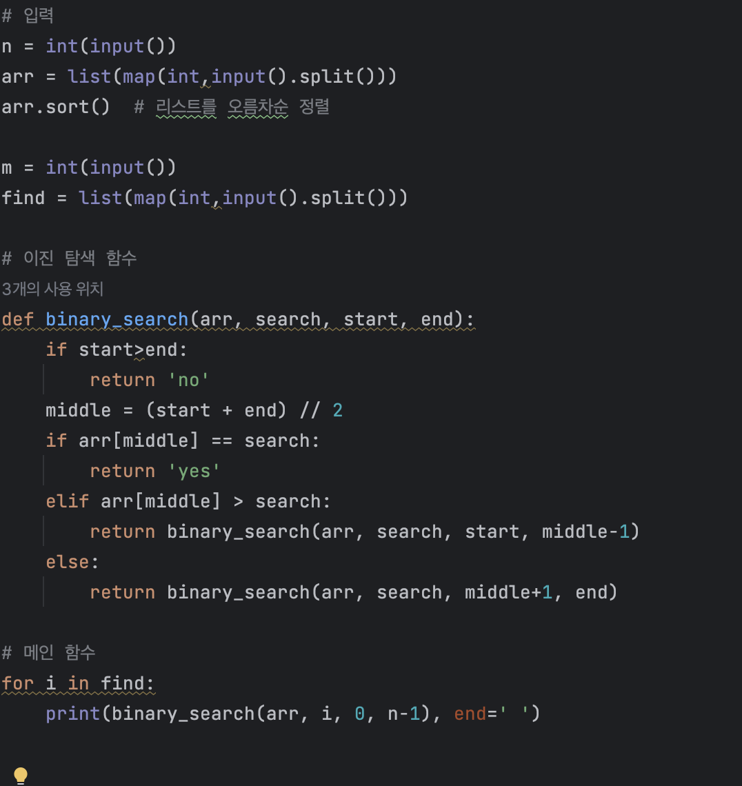 - 첫째 줄에 공백으로 구분하여 각 부품이 존재하면 yes를, 없으면 no를 출력한다.