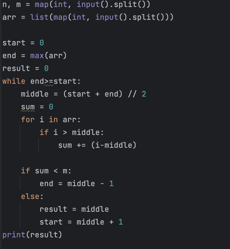 - 적어도 M만큼의 떡을 집에 가져가기 위해 절단기에 설정할 수 있는 높이의 최댓값을 출력한다.