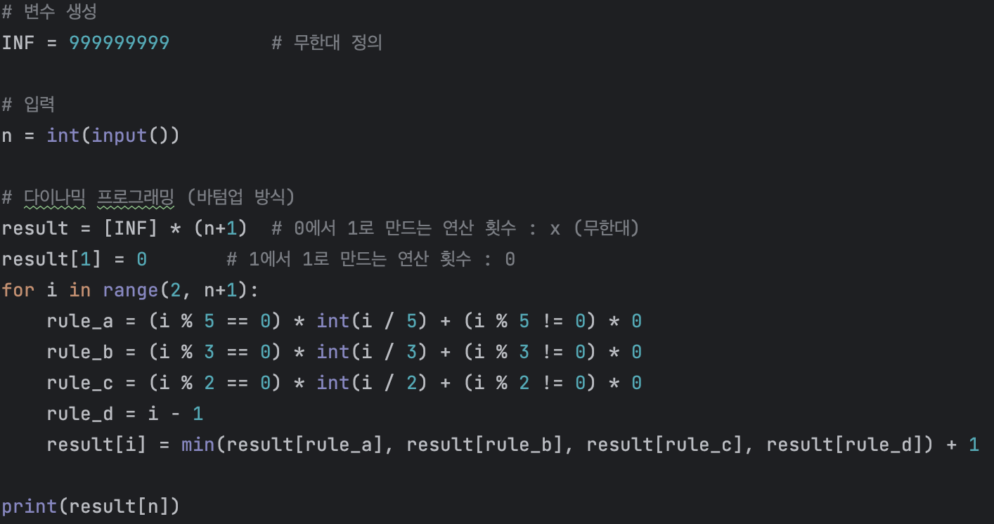 이 문제는 정수 X가 주어졌을 때, X를 1로 만들기 위해서 연산을 계속해서 진행해야 한다. 이 때 최소 연산 횟수를 통해서 만들어야 하기 때문에 재귀 함수를 구현해서 1로 만드는 경우의 최소 횟수를 비교해서 최솟값을 출력할 수 있다. 그러나 이는 최대 재귀 스택을 넘어가는 오류를 초래할 수도 있고, 많은 메모리를 잡아먹을 뿐 아니라 시간도 오래 걸리는 방법이다. 이를 다이나믹 프로그래밍의 바텀업 방식으로 해결할 수 있다.
