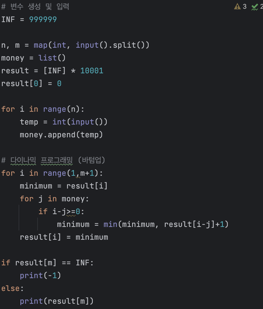 이 문제는 바텀업 방식을 통해서 반복문을 M 까지 돌면서 결과 리스트에 화폐 개수를 저장하는 방식으로 해결할 수 있다. 먼저 결과 리스트를 생성하고 무한대로 초기화 한다. 그리고 반복문을 1부터 M까지 돌면서 입력받은 화폐 종류에 대해서도 다시 반복문을 돌린다. 바깥쪽 반복문에 해당하는 인덱스를 i라고 하면 i원을 만들기 위해 결과 리스트의 [i - 화폐 종류]를 비교하여 최솟값을 산출하고 최솟값 + 1 을 인덱스 i에 저장하면 된다. 이 때 1을 더하는 이유는 해당 화폐 1개만 추가하면 i원을 만들 수 있기 때문이다.