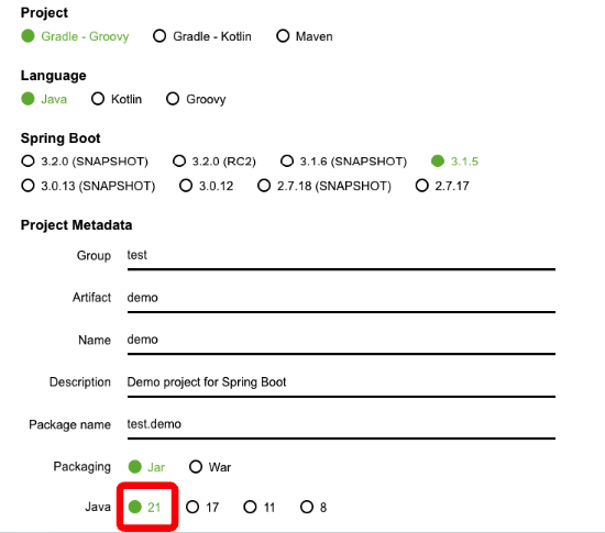 start.spring.io에서 프로젝트 생성 시 자바 버전 : Java 21