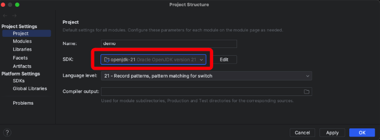 SDK 버전을 프로젝트 생성 시 설정했던 버전과 동일하게 변경 (openjdk-21)