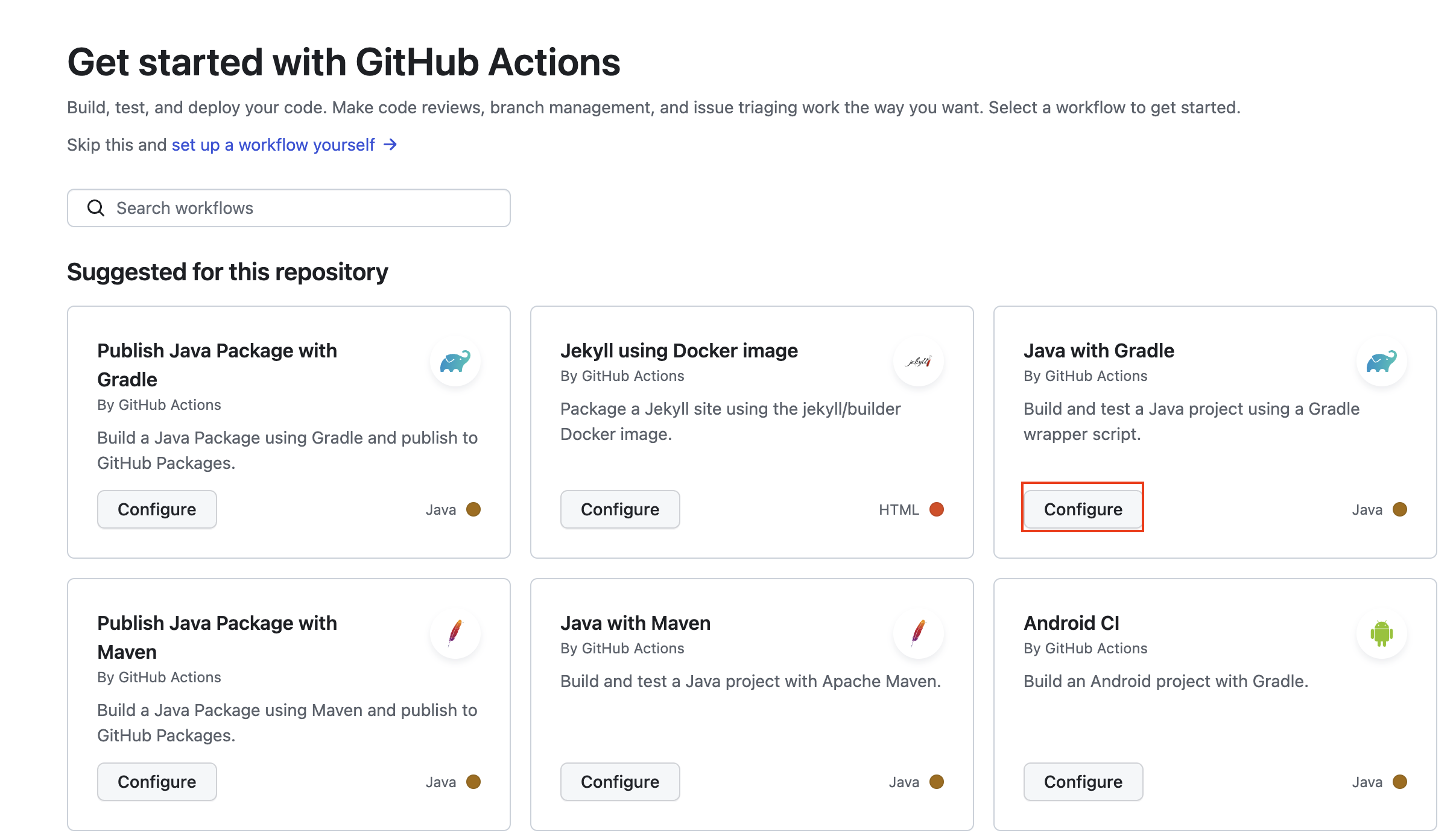 - Get started with GitHub Actions > Java with Gradle 클릭 (없다면 검색)