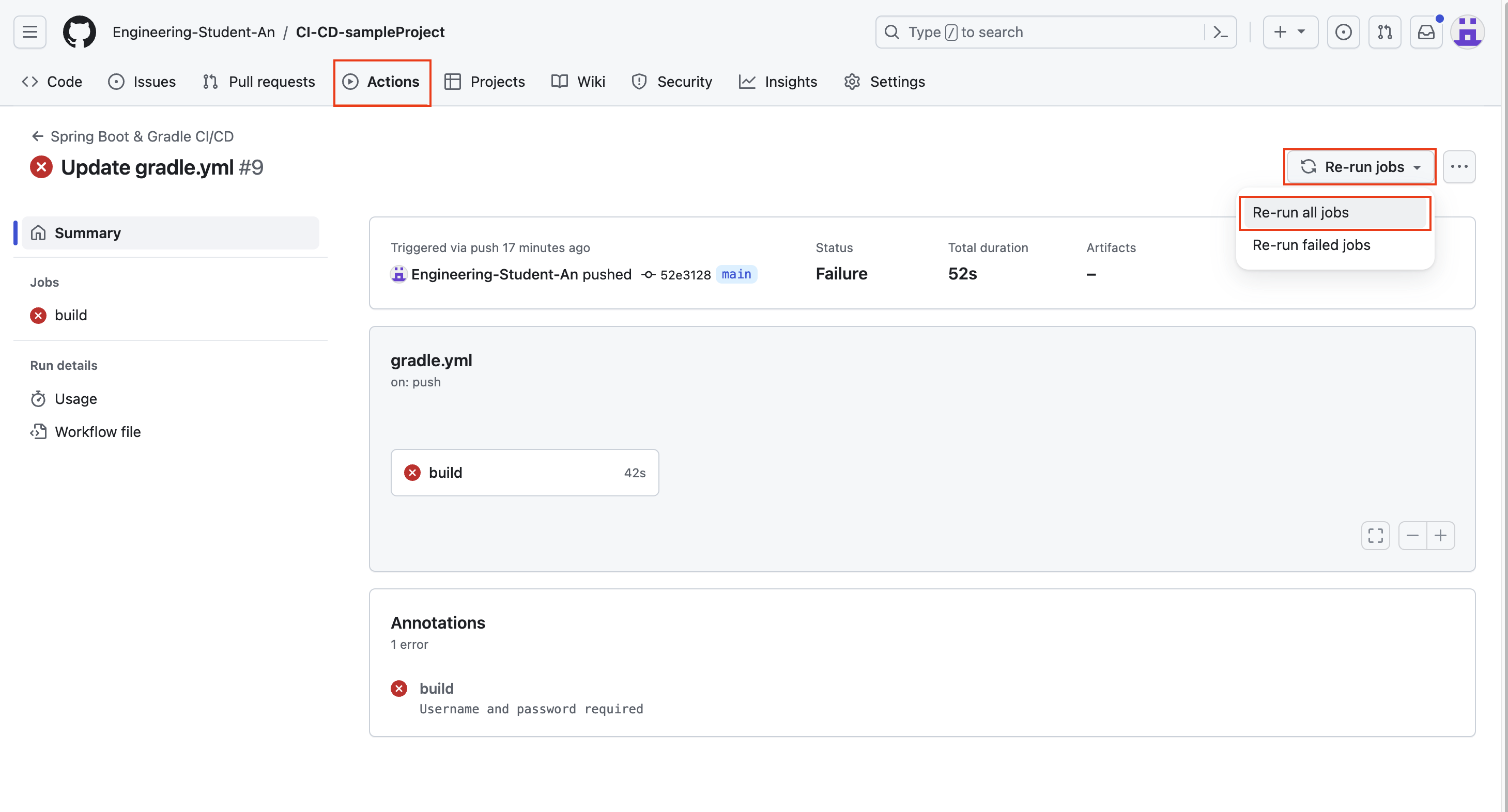 - 다시 Actions 탭으로 돌아가서 Re-run