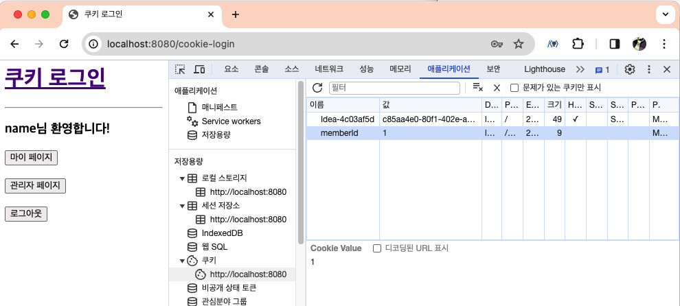 - 개발자 도구로 들어가면 생성된 쿠키의 정보를 볼 수 있음