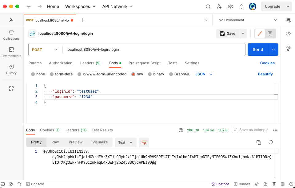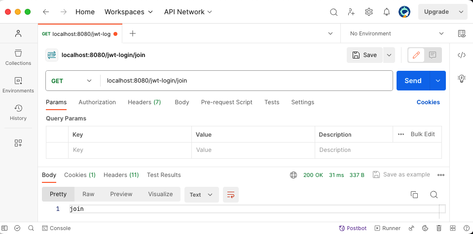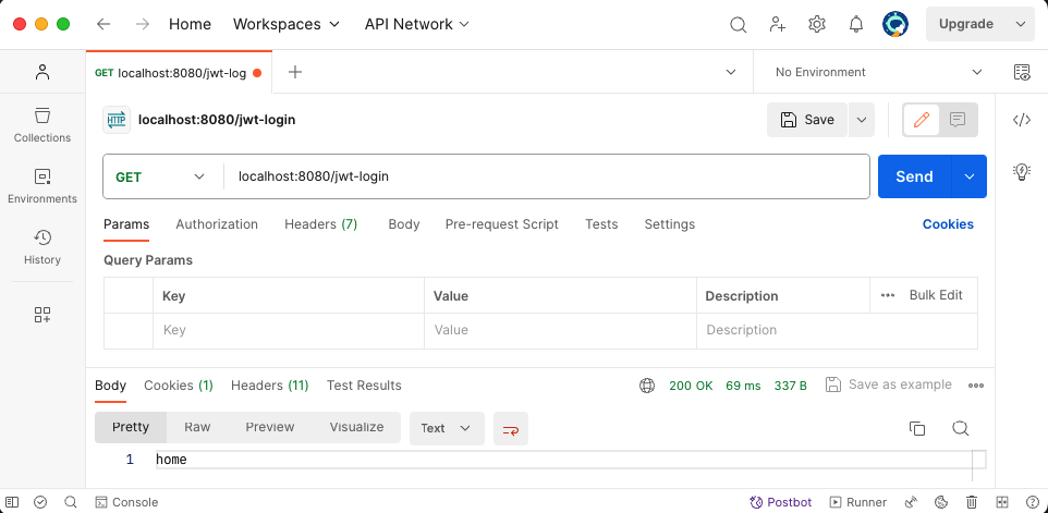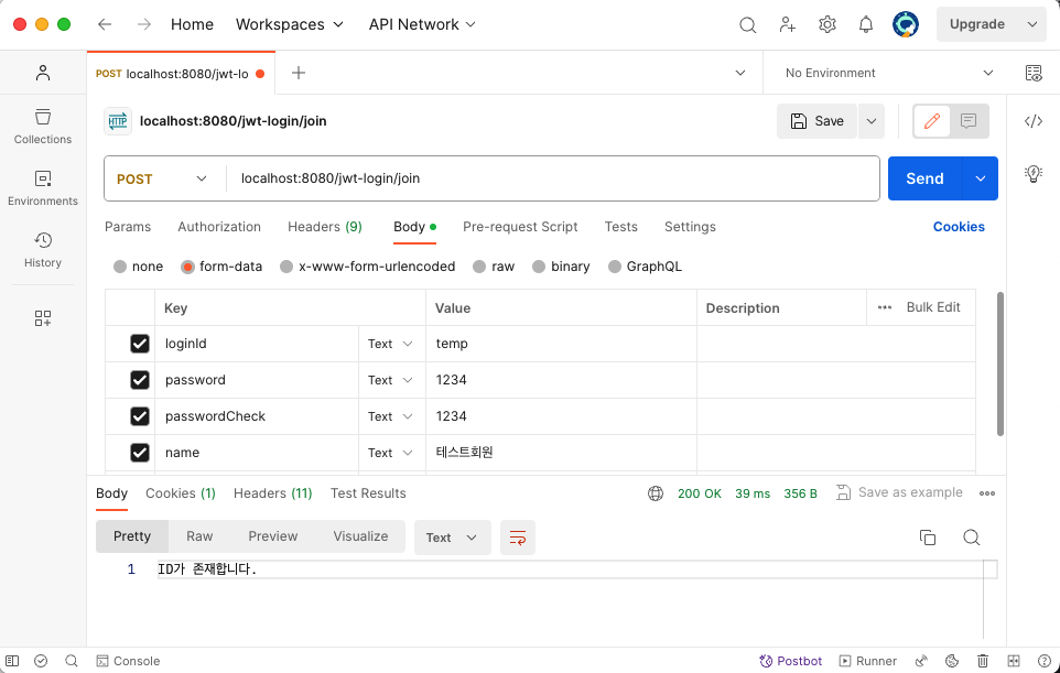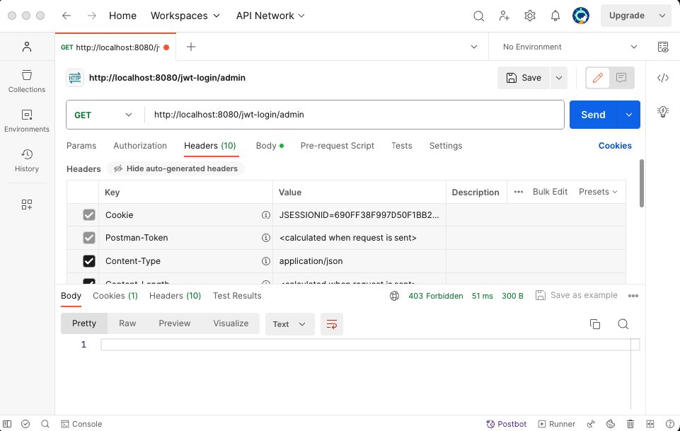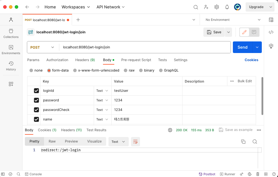 - 폼 로그인을 disable 설정했기 때문에 POSTMAN을 통해서 POST 요청을 보내서 결과 확인