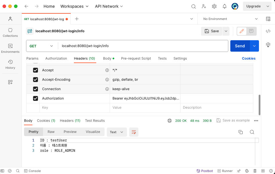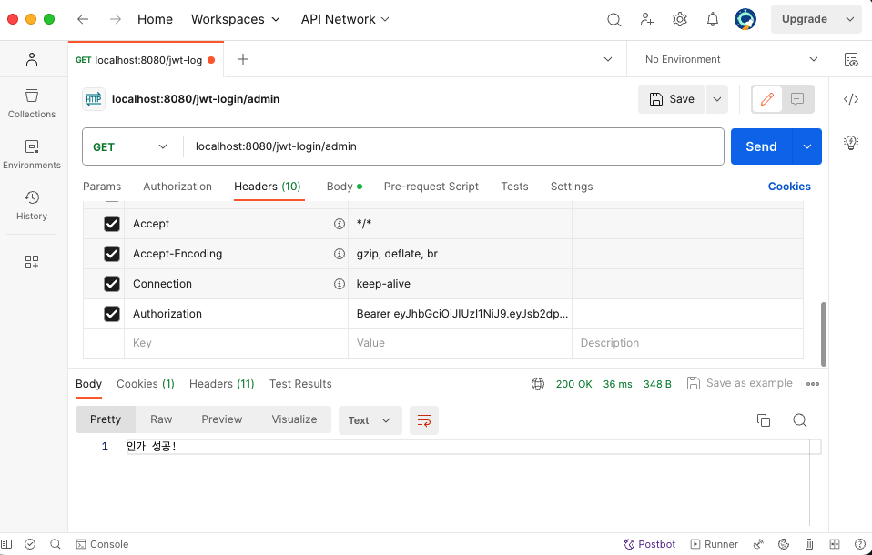 - 발급한 토큰을 복사해서 Headers > Authorization에 추가할 것