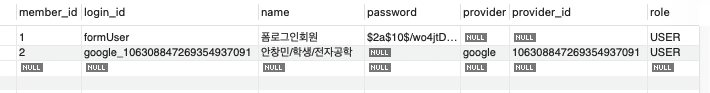- Form 로그인 사용자는 provider와 providerId가 비어있음