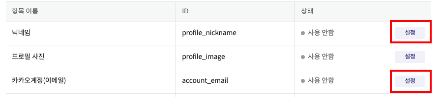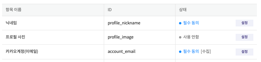 - 다시 동의항목 탭으로 돌아가면 카카오계정 (이메일) 이 활성화 되어 있음