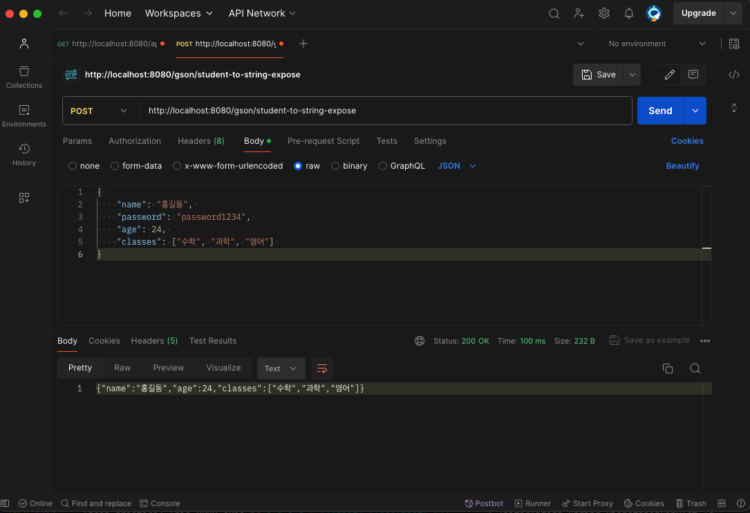 - Student 클래스에 JsonString으로 변환하고 싶은 (노출하고 싶은) 필드에 @Expose 어노테이션 추가함